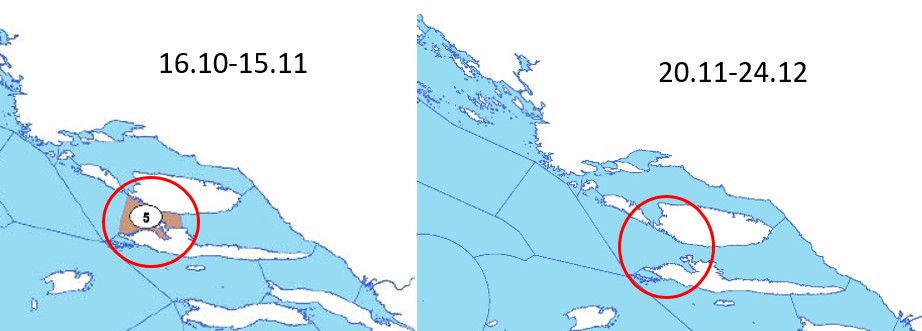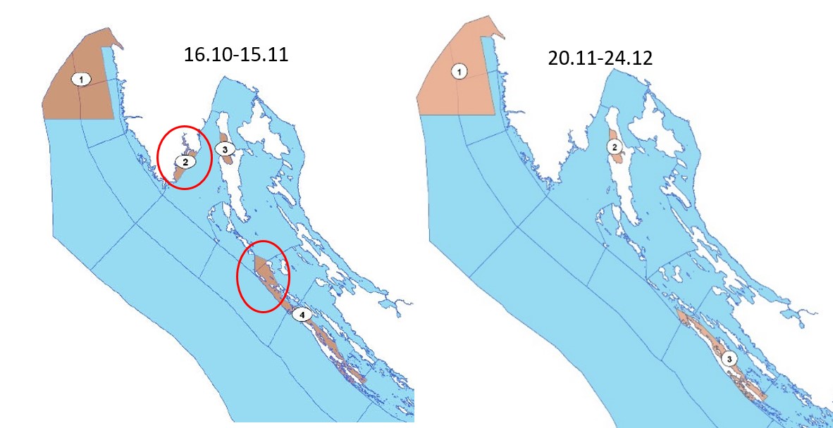 Područja zabrane obavljanja ribolova se razlikuju, jer je su u novoj zabrani izostavljena dva područja - uz istočnu obalu Istre i kod otoka Hvara. Dodatno je izostavljeno i područje oko Silbe i Ilovika.