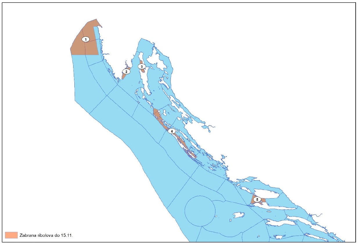 4. Unutar područja omeđenog: Rt Radovan (o. Ilovik) – o. Kamenjak – SZ rt o. Premuda – o. Masarine – Rt Veli rat (Dugi otok) – istočnom obalom Dugog otoka – istočnom granicom PP Telašćica i NP Kornati – λ15° 22,27' Φ43° 47,26' – λ15° 24' Φ43° 48,55' – JI rt o. Žut – SZ rt o. Žut – o. Lavdara Mala – JI rt Lavdara – sjeverni rt o. Lavdara – Rt Parda (o. Veli Iž) – Rt Poljšinjac – Južni Rt (o. Zverinac) – Rt Zmorašnji – južni rt o. Vela Tramerka – sjeverni rt o. Vela Tramerka – Rt Benuš (o. Ist) – Rt Kok – Rt Mavrova (o. Silba) – Rt Samotvorac – Rt Radovan (o. Ilovik)